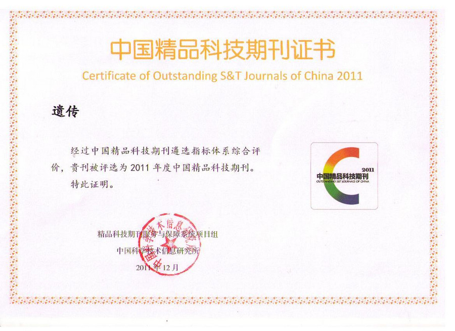 12月2日,中国科学技术信息研究所在北京召开“中国科技论文统计结果发布会”,300种期刊被评选为2011年度中国精品科技期刊,《遗传》杂志榜上有名。