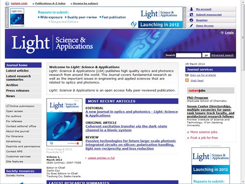 目前,Nature的网站平台上已建立了LSA期刊网站和电子审稿系统;在全球范围内为LSA进行了大量的宣传与约稿工作。LSA的出版,必将对国际光学领域学术交流和中国光学科学技术发展做出积极的贡献。