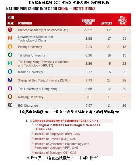 报告列出了2011年中国十大科研机构的排名:中国科学院、中国科学技术大学、北京大学、清华大学、香港科技大学、厦门大学、上海交通大学、香港大学、南京大学和深圳华大基因。在此排名中,中国科学院遥遥领先,总共在《自然》系列期刊上发表了62篇论文,其中上海生科院在中科院各研究所中排名第一。