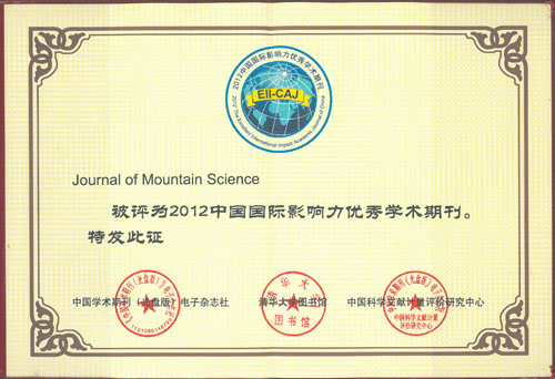 日前,《中国学术期刊影响因子年报&国际引证报告》暨“中国最具国际影响力学术期刊”发布会在国家会议中心首次发布了《中国学术期刊国际引证报告》(CAJ-IJCR)。成都山地灾害与环境研究所主办的Journal of Mountain Science 和《山地学报》均被授予“2012年中国国际影响力优秀学术期刊”。