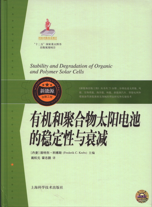 译著《有机和聚合物太阳电池的稳定性与衰减》是丹麦科技大学Frederik C. Krebs主编的Stability and Degradation of Organic and Polymer Solar Cells 一书的中文译本。该书由戴松元研究员和霍志鹏博士翻译。全书以宽阔的视角展现了有机和无机太阳电池的稳定性和衰减特性,主要内容包括:不同光伏技术及其衰减,电池衰减的化学红外物理探测方法,小分子有机光伏器件的衰减,基于有机聚合物太阳电池的衰减,有机太阳电池稳定性测试设备,有机光伏器件寿命的表征和报告,聚光条件下的有机光伏器件以及阻隔技术与应用。