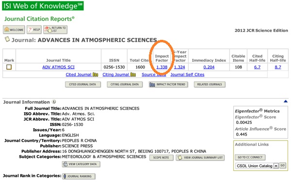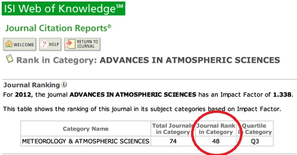 根据汤森路透 (Thomson Reuters) 科技信息集团6月20日发布的2012年SCI期刊引证报告,由我所和IAMAS中委会主办的Advances in Atmospheric Sciences (AAS)2012年影响因子达到1.338 (图1),相比于2011年的0.987,实现了重要的突破。同时,AAS在全球74种同类期刊排名48, 属于Q3区(图2),在亚洲同类期刊中排名最高。