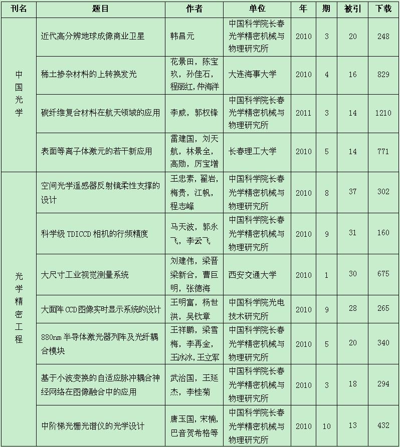 表1 《中国光学》、《光学 精密工程》获奖论文名单