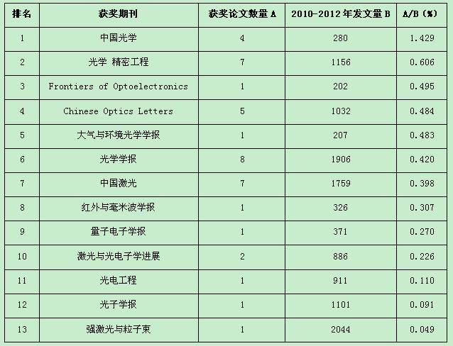 经过编辑部推荐、专家严格评选、网上公示,共评选出13种光学期刊的40篇优秀论文(见表2)。按各期刊获奖论文数量占2010-2012年发文量百分比排名,《中国光学》排名第一(1.429%),《光学 精密工程》排名第二(0.606%),表明这两种期刊高水平和高被引频次论文数量较多,学术影响力较大。