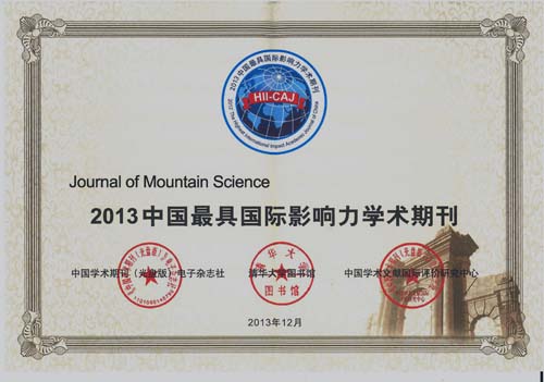 日前,由成都山地灾害与环境研究所主办的英文期刊Journal of Mountain Science 入选由中国学术期刊(光盘版)电子杂志社、清华大学图书馆和中国学术文献国际评价研究中心联合评定的“2013中国最具国际影响力学术期刊”。这是继本刊入选“2012中国国际影响力优秀学术期刊”后获得的更高的荣誉。