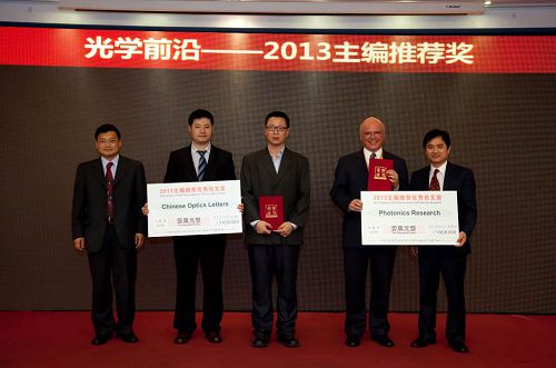 今年还特别增设了Chinese Optics Letters“封面优秀论文奖(Cover Paper Award)”和2013年“主编推荐奖(EIC's Choice Award)”。面向杂志社出版的Chinese Optics Letters,High Power Laser Science and Engineering 以及Photonics Research 等3刊。美国两院院士、斯坦福大学David A. B. Miller教授,美国罗切斯特大学Joseph Eberly教授,美国海军实验室Stephen Bodner和浙江大学李明宇教授的优秀论文入选首届EIC's Choice Award。