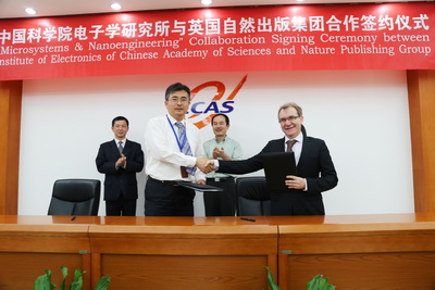 5月28日,中国科学院电子学研究所与英国自然出版集团(Nature Publishing Group,NPG)正式签署了期刊Microsystems & Nanoengineering 的合作出版协议,共同打造微系统和纳米工程领域国际最高学术影响力期刊。中国科学院电子学研究所所长吴一戎院士和自然出版集团大中华区总监Nick Campbell博士在签约仪式上分别做了发言。美国明尼苏达大学机械工程教授崔天宏博士,传感技术国家重点实验室(北方基地)主任夏善红研究员及编辑部相关人员出席了签约仪式。