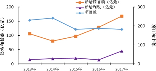2017年统计项目共182项,其中陕西148项,宁夏34项;涉及陕/宁两省区20多个地市县,121家企事业单位,中科院33家机构。与2016年相比,合作项目在数量和分布上基本保持平稳,主要经济和社会效益集中在能源化工、装备制造、生物技术三大领域。2017年,中科院为陕西和宁夏实现新增销售收入167.9亿元,较上年上升30.2%,新增利税45.5亿元。其中,为陕西新增销售收入141.5亿元、利税41.7亿元、社会效益360.9亿元;为宁夏新增销售收入26.4亿元、利税3.75亿元、社会效益103.19亿元。
