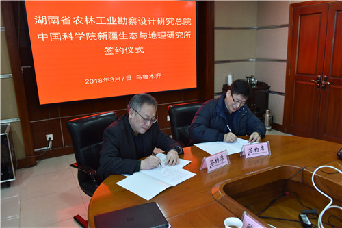 3月7日,中国科学院新疆生态与地理研究所和湖南省农林工业勘察设计研究总院在新疆签署战略合作协议。新疆生地所所长雷加强和湖南林勘院院长康庆云分别代表双方签字。