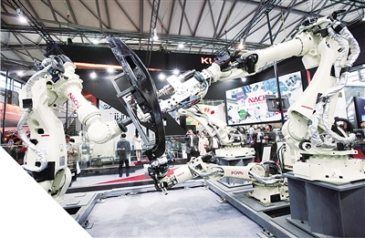 第16届中国国际工业博览会上,一组工业机器人在进行操作演示。 新华社记者 方 喆摄