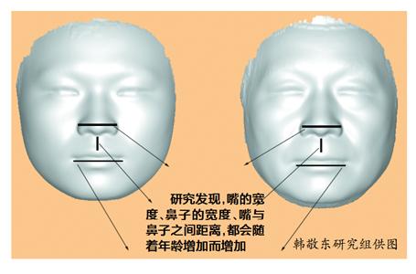 怎样才能更精准地预测人的衰老程度?韩敬东研究组另辟蹊径,用计算生物学方法对人的面部进行了深入研究。为此,研究组与北京市疾控中心合作,使用3D相机采集了332名17岁至77岁中国志愿者的三维面部图像,并分析了面部的衰老特征。通过与17岁至29岁、60岁至77岁男性和女性“平均脸”(用三维坐标平均值构成的脸)的比对,研究发现,嘴的宽度、鼻子的宽度、嘴与鼻子之间距离,都会随着年龄增加而增加,眼角则随着年龄的增加出现下垂。研究人员将每位参与者的面部三维坐标输入计算机回归模型,进行模拟计算,得到了他们的生理年龄。