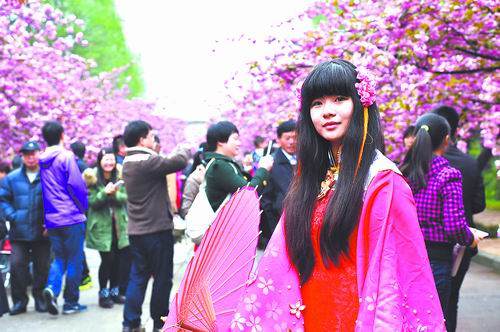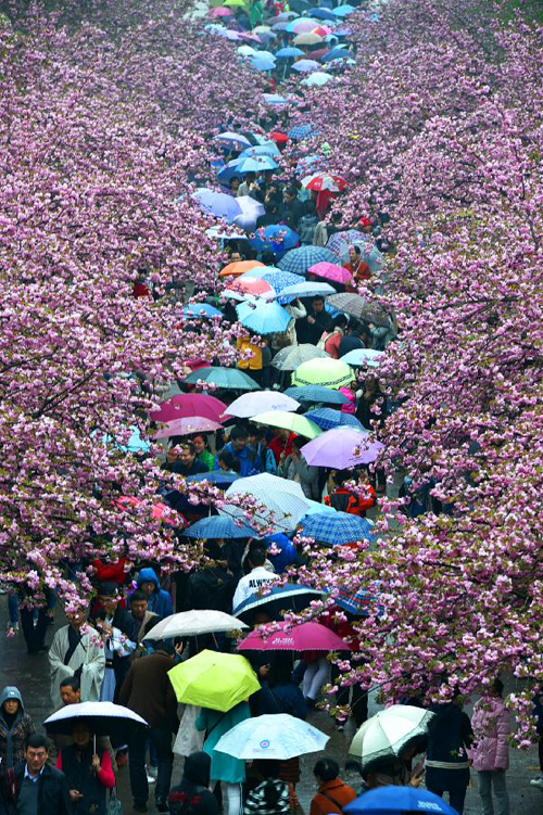 当日,位于安徽合肥的中国科学技术大学举办“春风汉韵”樱花游园会。雨中盛开的樱花和身着汉服表演的学生吸引了众多游客。