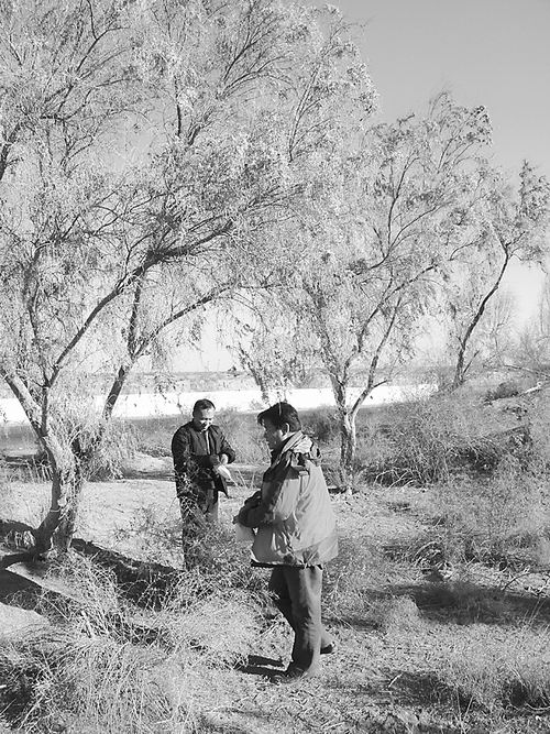 吐鲁番沙漠植物园的科研人员潘伯荣(右)和尹林克(左)在乌兹别克斯坦采集黑梭梭的种实。
