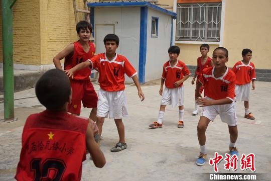 中科院新疆分院自2014年3月以来,先后派出3批累计27名领导干部进驻墨玉县加罕巴格乡巴西恰瓦格村和阿依玛克村。图为工作组在巴西恰瓦格村组建的双语篮球队,通过打篮球促进当地孩子学习语言。张素 摄