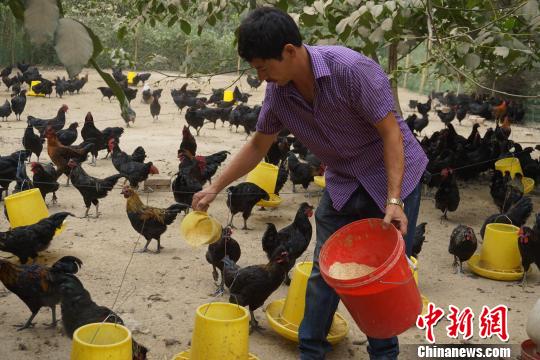 中科院新疆分院自2014年3月以来,先后派出3批累计27名领导干部进驻墨玉县加罕巴格乡巴西恰瓦格村和阿依玛克村。图为工作组在阿依玛克村设的林下养鸡示范点,村民艾力努尔巴克正在喂养黑鸡。张素 摄