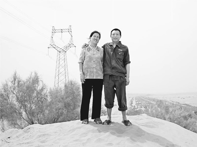 沙漠公路看护者黄自友夫妇站在沙漠公路边合影。新华社记者 金立旺摄