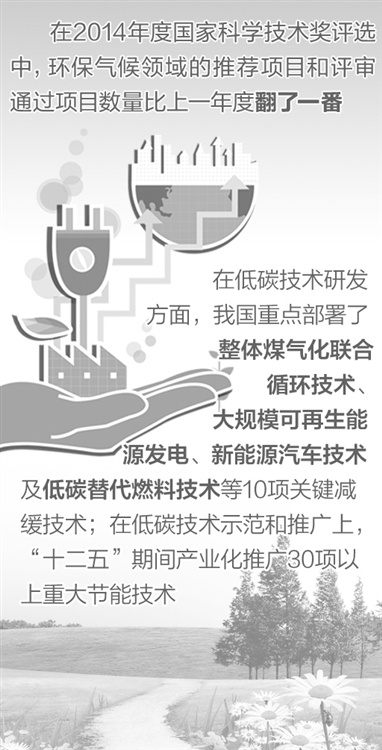 在低碳技术研发方面,我国重点部署了整体煤气化联合循环技术、大规模可再生能源发电、新能源汽车技术及低碳替代燃料技术等10项关键减缓技术。同时,还部署了极端天气气候事件预测预警技术、干旱地区水资源开发与高效利用等10项关键适应技术。在863计划和科技支撑计划中开展能源清洁高效利用技术、重点行业工业节能技术与装备开发、重点行业清洁生产关键技术与装备开发等,取得了一批具有自主知识产权的发明专利和重大成果。