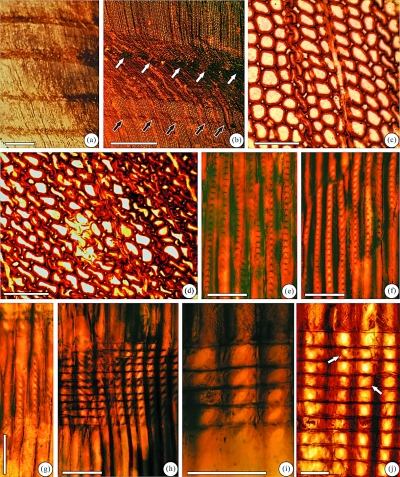 辽西建昌原始落羽杉型木(新种)解剖特征图:(a-b)横切面,示年轮;(c)横切面,示管胞之间的胞间隙;(d)横切面,示扭曲的管胞;(e-f)径切面,示单列紧挤排列的管胞。资料照片