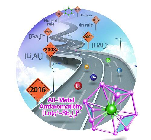 孙忠明课题组以稀土配位化学为主要研究手段,围绕稀土—主族金属元素如何稳定成键这一关键科学问题开展工作,成功制备出首例具有全金属反芳香性的稀土分子合金。在该团簇中,稀土离子被三个Sb4菱形环所围绕,形成了一个类似茂稀土的结构。