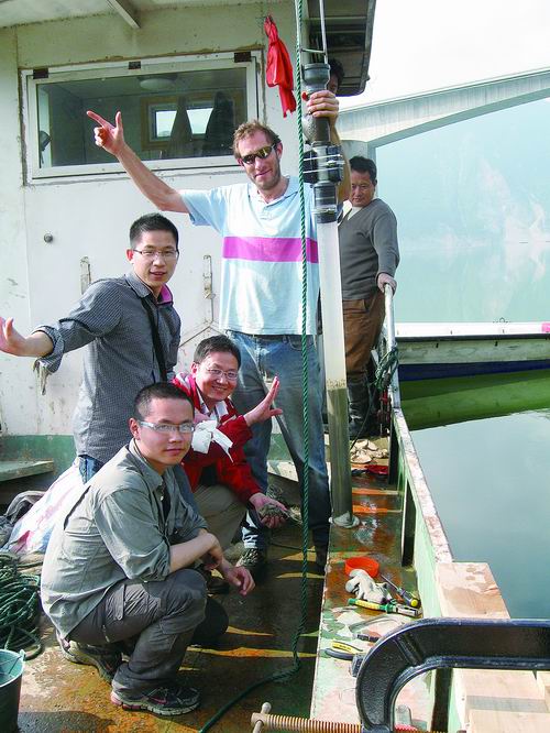 据悉,他们在水库做扫描时,每天6点就起床,吃完早饭,直接上船开始工作,中午饿了就吃点干粮。不管是烈日暴晒还是大雨淋漓,每个人最多就戴个帽子遮挡,一直工作到天黑了,才行船上岸,身上都是泥水,就连一起工作的开船师傅也颇有怨言。在这样环境下,每次一干就是好几天。张飞博士为记者讲述2010年3月他们的那次考察花絮:在水库扫描的同时,他们划了一条约2米长的小皮筏艇,到稍偏远的地方钻取沉积物岩心。“当时,皮艇上除了我和Joshua外,还有一个几十斤重的手动钻。由于沉积物很松散,我们试了几次都没有成功,这个时候我们俩已经累得筋疲力尽。恰好在这个时候,我们发现皮筏艇的气漏了快一半。顷刻间,我俩开始着急了,拼命地往岸边划。刚到岸边的时候,水已漫过了皮筏艇。上岸后,我俩看着对方,都哈哈地大笑起来。”张飞博士回忆着。