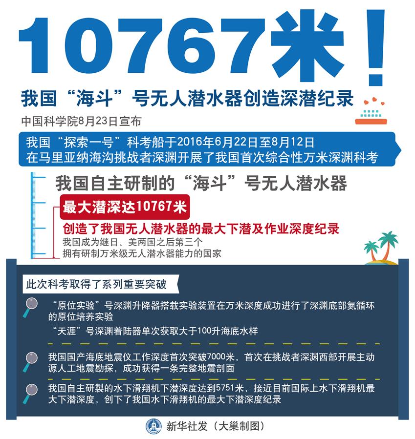 中国科学院8月23日宣布,我国“探索一号”科考船于2016年6月22日至8月12日在马里亚纳海沟挑战者深渊开展了我国首次综合性万米深渊科考。在此次科考中,我国自主研制的“海斗”号无人潜水器成功进行了一次八千米级、两次九千米级和两次万米级下潜应用,最大潜深达10767米,创造了我国无人潜水器的最大下潜及作业深度纪录,使我国成为继日、美两国之后第三个拥有研制万米级无人潜水器能力的国家。