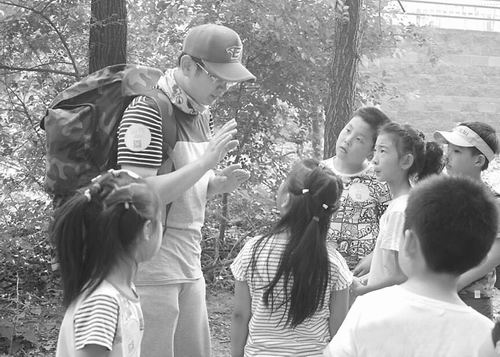 但在孩子面前,他又摇身一变,成了给小朋友们讲趣味户外课的“动物博士”。