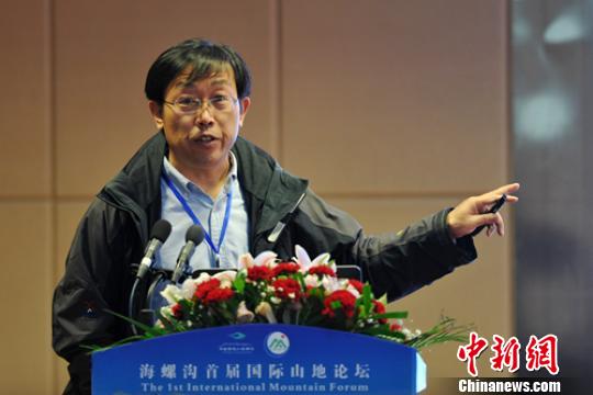 中科院寒区旱区环境与工程研究所刘时银研究员正在作《贡嘎山冰川及其变化》发言。刘忠俊摄