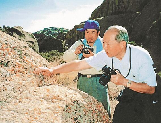 2002年,赵尔宓(右)在新疆怪石沟拍摄蜥蜴。