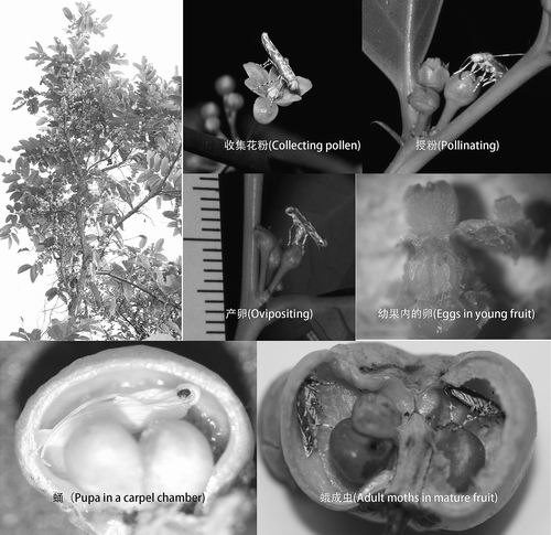 访花结束的同时,幼果内艾胶头细蛾的卵也与果同步进入休眠期,直到果实发育前才开始孵化成幼虫,并进入到一粒种子内继续取食和发育。每条幼虫发育只取食单个心皮内两粒种中的一粒,另一粒将成为植物繁殖的保障。艾胶算盘子果实与种子发育不同步,快速发育的果皮与缓慢发育的种子之间形成了一个空腔,这为幼虫发育后化蛹、结茧和成虫生存提供了恰到好处的“家”,以至艾胶头细蛾从卵到成虫整个生活史都是在果实内完成的。夜幕下,果实裂开散布种子的同时,成群的蛾子也从果内飞出,并进入树的顶端进行交配。雄成虫完成交配后的当晚就死去,雌虫完成交配后立即进入工作状态,为寄主植物传粉,并产卵繁殖后代。多年的完整跟踪记录和研究发现,艾胶算盘子与艾胶头细蛾无论在花物候与生活史,还是在形态结构方面都形成了完美的适应,堪称“天作之合”。