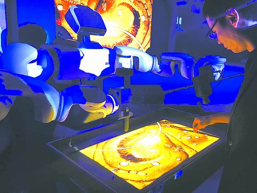 中科新松双臂协作机器人与人一起进行沙画表演。倪思洁摄