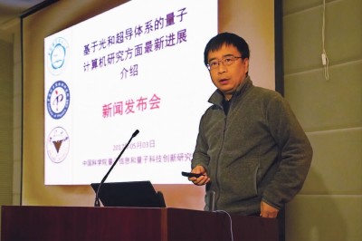 潘建伟在新闻发布会上介绍量子计算机的最新研究进展。记者谢震霖摄