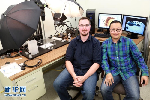 科学家首次在琥珀中发现雏鸟标本图为邢立达与加拿大萨斯喀彻温省皇家博物馆瑞安·麦凯勒教授的工作合影。新华社发