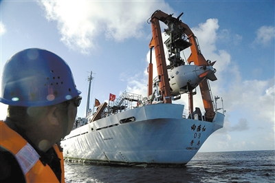 “蛟龙”号离开科考船欲进入水中完成马里亚纳海沟最后一潜。