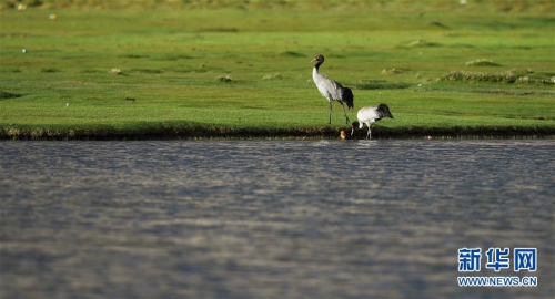 一对成年黑颈鹤带着宝宝在藏北羌塘草原觅食(6月23日摄)。西藏阿里,被称为“世界屋脊的屋脊”。第二次青藏高原综合科考目前正在这里进行。七夕之际,科考队专家、中科院西北高原生物研究所副研究员连新明讲述了青藏高原精灵“情侣”们的“爱情”故事。新华社记者 普布扎西 摄