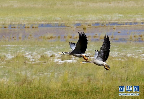 8月25日在西藏阿里地区拍摄的一对展翅飞翔的斑头雁。西藏阿里,被称为“世界屋脊的屋脊”。第二次青藏高原综合科考目前正在这里进行。七夕之际,科考队专家、中科院西北高原生物研究所副研究员连新明讲述了青藏高原精灵“情侣”们的“爱情”故事。新华社记者 刘东君 摄