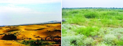 达拉特旗荒漠化综合治理试验站治理前景观,左拍摄于2001年。记者胡冬冬翻拍