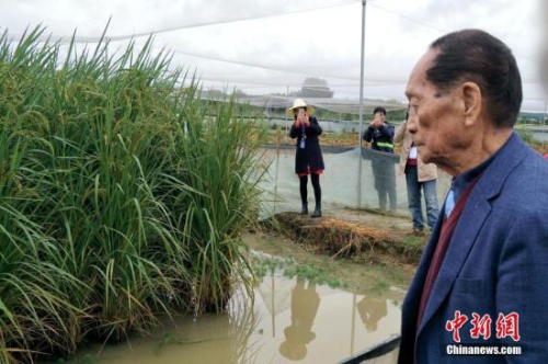 图为“杂交水稻之父”袁隆平观察“巨型稻”生长情况。中新社记者 徐志雄 摄
