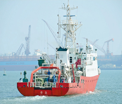 4月18日,“科学三号”调查船驶离山东青岛西海岸新区母港。俞方平摄(新华社发)