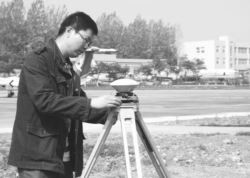 除了检查机上设备,还需在地面作准备。吴亮熟练地拿出测绘仪器,走到停机坪附近的一块草地上架设GPS基站。“飞机上航测相机的GPS和地面基站的GPS两个数据联合起来,做一个差分处理,这样定位信息就会更精确。”吴亮幽默地表示,自己平时遥感航拍图像看习惯了,还会觉得自己用手机拍出来的照片“精度太低”。