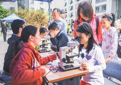 国家天文台“公众科学日”活动在京举行。图为天文爱好者们观察陨铁标本。记者 杨子岩摄