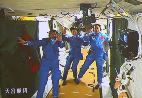 北京航天飞控中心大屏幕显示航天员景海鹏、刘洋、刘旺(从右至左)在天宫一号实验舱内(2012年6月18日摄)。