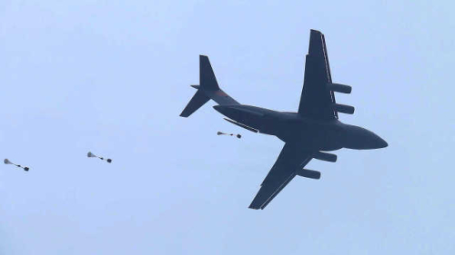 中国空军大型运输机运-20与空降兵部队联合开展空降空投训练(资料照片)。新华社发