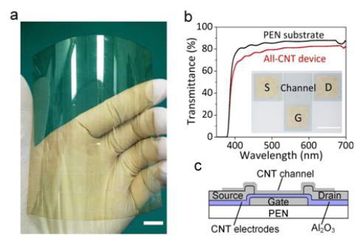 图为大面积柔性全碳器件。a柔性透明全碳器件照片。b器件光学透过率曲线。c全碳薄膜晶体管结构示意图。中国科学院金属研究所供图。