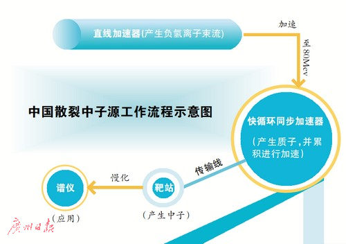 从散裂中子源的工作流程来看,首先是离子源产生负氢离子束流并通过直线加速器加速到80MeV,再注入到快循环同步加速器;经过剥离膜转换为质子;质子束流积累到足够强并进一步加速,达到16亿电子伏特的能量后,从环形同步加速器中引出,经传输线去轰击原子系数很高的重金属靶;金属靶的原子核被撞击产生中子,经慢化后射向样品,通过与物质原子核的相互作用获得样品物质结构的信息,供研究之用。