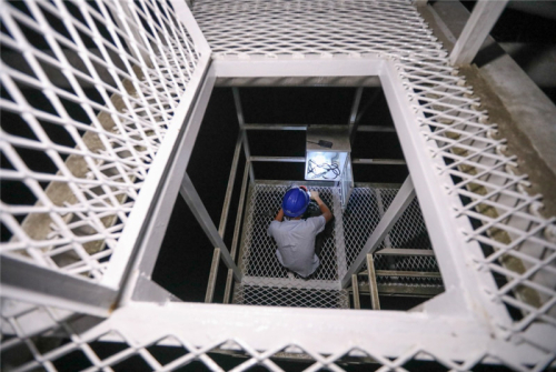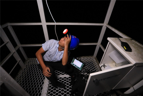 9月11日,工作人员在圈梁上对“中国天眼”进行维护。新华社记者 欧东衢 摄
