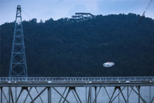 9月11日,“中国天眼”馈源舱升起在空中。新华社记者 刘续 摄