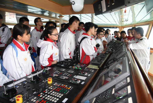 3月16日,学生在“科学”号科考船驾驶台参观。新华社记者 李紫恒 摄