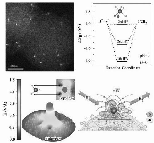 研究人员通过理论模拟发现,弯曲的“松球”表面会在尖端铂原子处形成非常强的局域电场,相当于给铂原子的“脚”戴上了加速履带,可以进一步增强催化效率。江俊介绍,类似尖端放电效应,“松球”曲面上的“松针”会积累负电荷,产生较强局域电场,加速吸引周围反应物粒子(带正电荷质子),因此,反应速度升高。