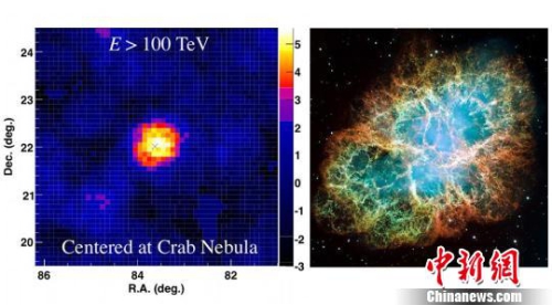 西藏羊八井ASgamma实验由中科院高能所和日本东京大学宇宙线研究所共同主持。中科院高能所实验团队介绍说,蟹状星云是位于金牛座的著名超新星遗迹,距离地球6500光年左右,其能量来源是位于其中的高速旋转的脉冲星,即蟹状星云脉冲星。蟹状星云在全电磁波段均具有较高的亮度,因此科学家在从射电、光学、X射线直至伽玛射线的整个电磁波段对其进行了详细的观测和研究。但是,随着光子能量的增加,光子流强越来越低,观测也越来越困难。此前,国际上探测到的最高能量的伽玛射线为75TeV,是德国的HEGRA切伦科夫望远镜实验组观测到的。这次中日合作实验团队发现了24个100TeV以上的伽玛射线事例,超出宇宙线背景5.6倍标准偏差,其中能量最高的约为450TeV。