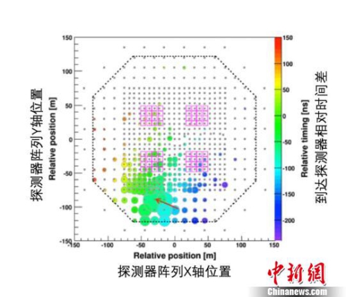 西藏ASgamma实验观测到的最高能量伽玛射线(450TeV)的空气簇射在探测器上产生的密度分布。中科院高能所